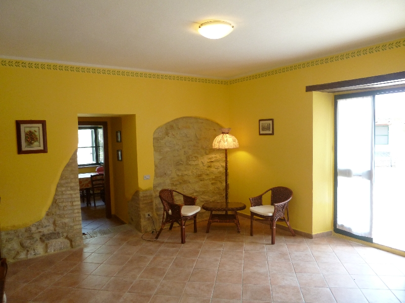 ~ a large dining room of 40 sqm. with cast iron stove and sofa.